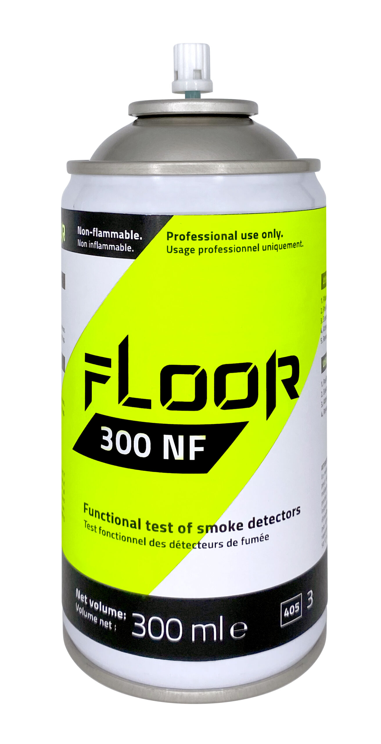 Aérosol FLOOR 300 NF pour tests de fumée. Aérosol de test 300 ml ininflammable pour déclecher les détecteurs automatiques de fumée. Compatible toutes marques d'outils et de détecteurs. Capacité de 300 ml plus importante que les autres produits pour réduire le coût du test. Conforme F-Gaz.